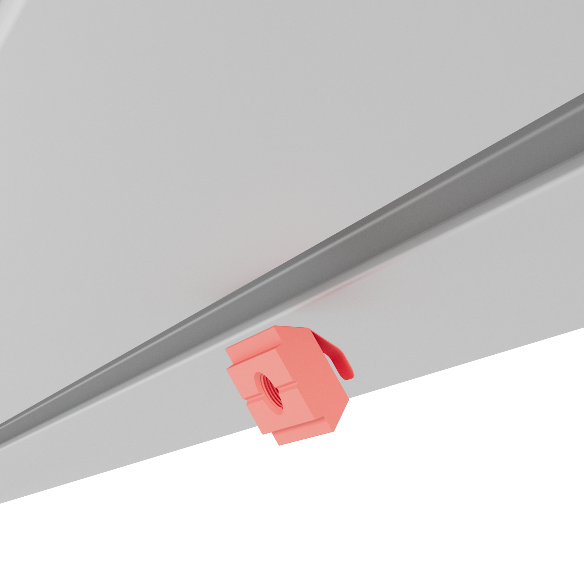 Wie alle LINEUP Komponenten ist auch der Produkthänger für eine schnelle und unkomplizierte Montage konzipiert. Er wird mithilfe des integrierten M5-Gewindes und der Nutführung direkt in den LINEUP Rahmenprofilen befestigt – vollständig werkzeuglos. Dies ermöglicht einen schnellen Aufbau, eine sichere Aufhängung und eine flexible Positionierung innerhalb des Systems.